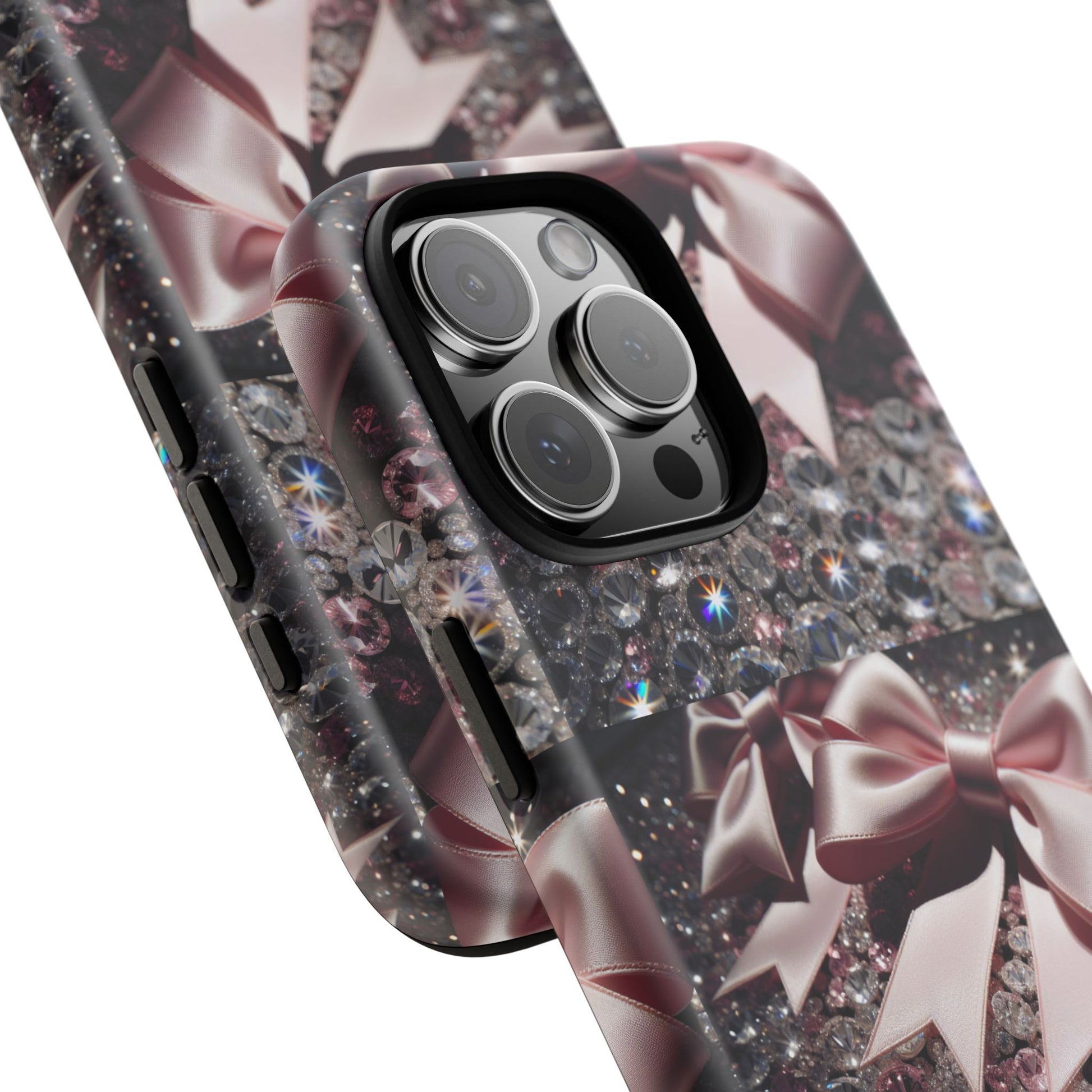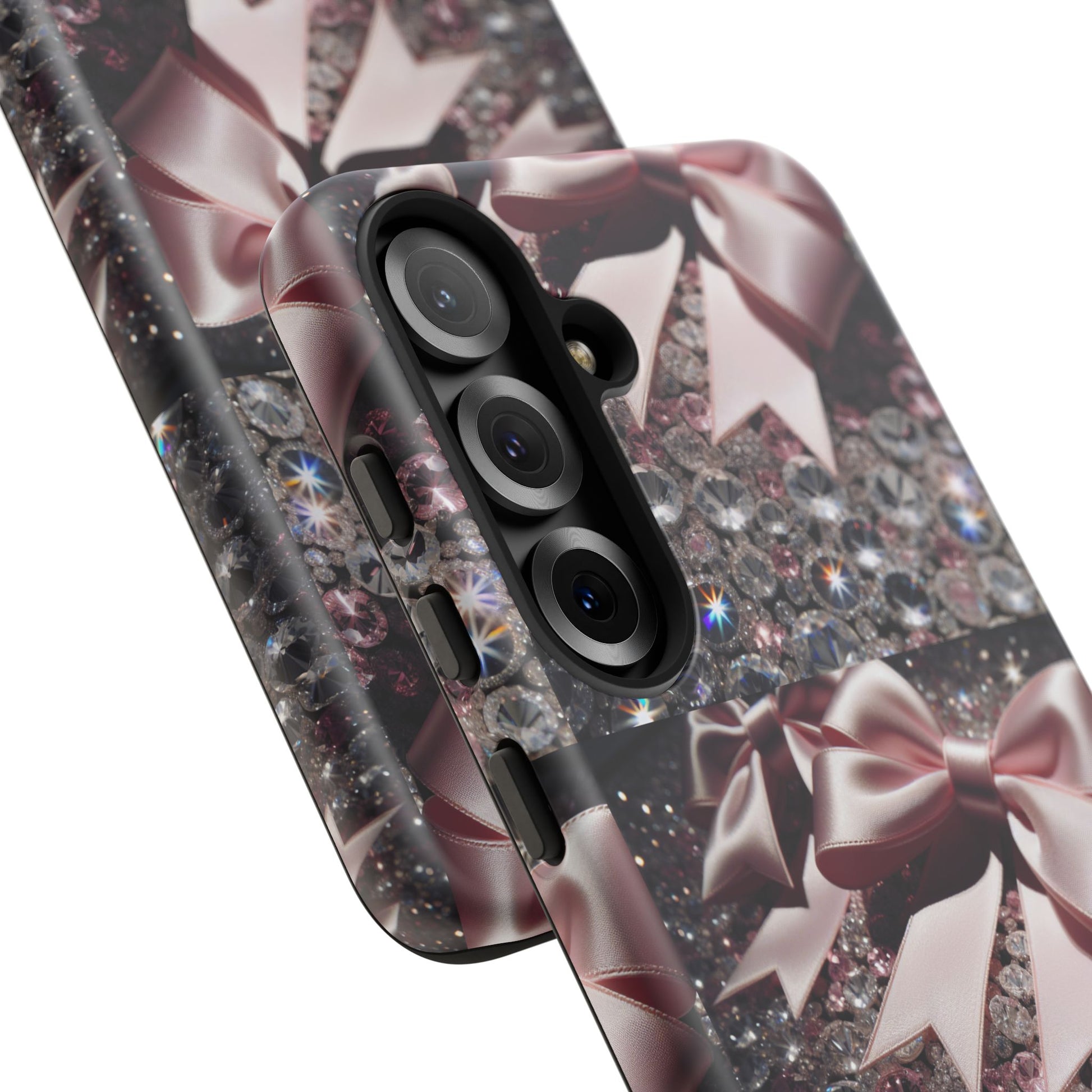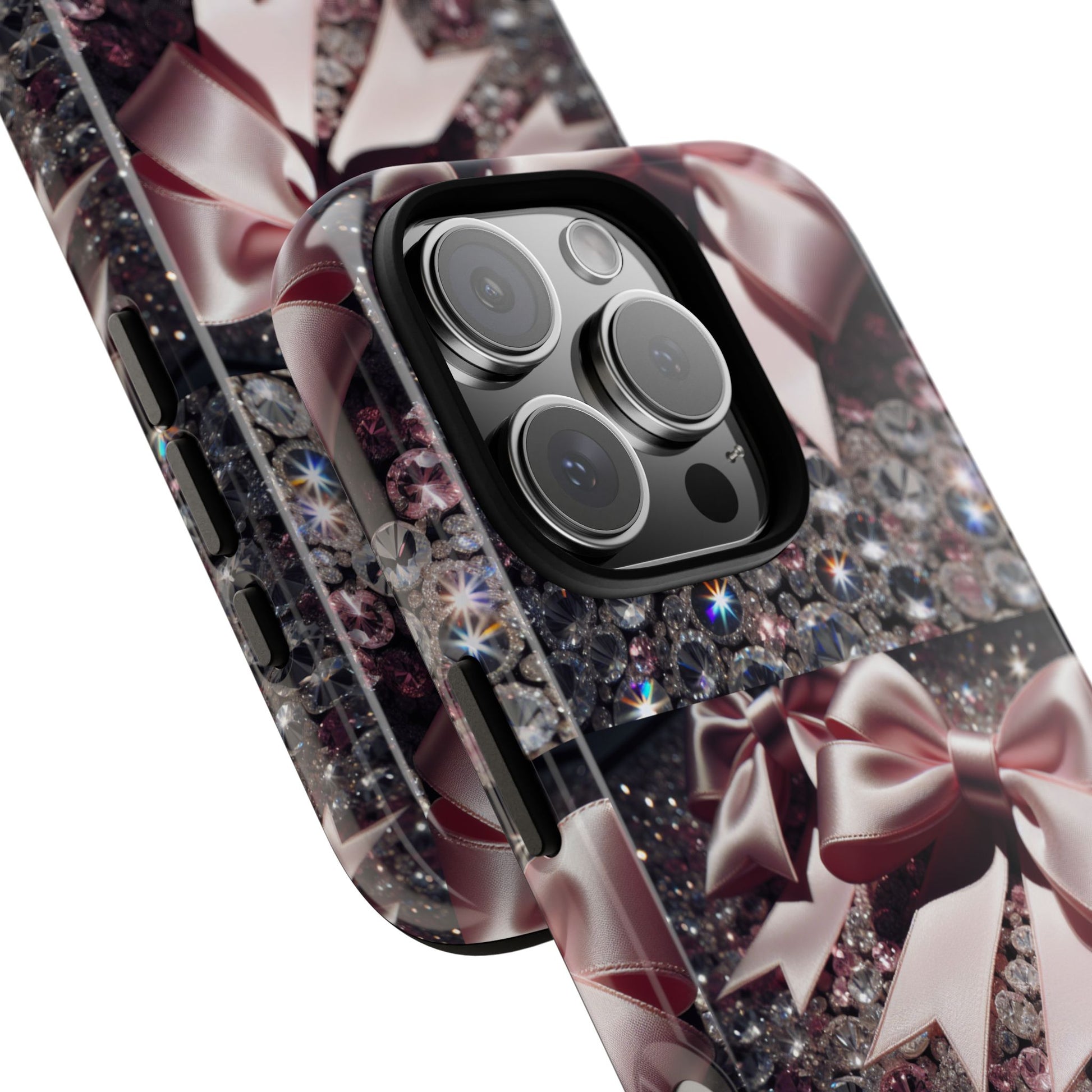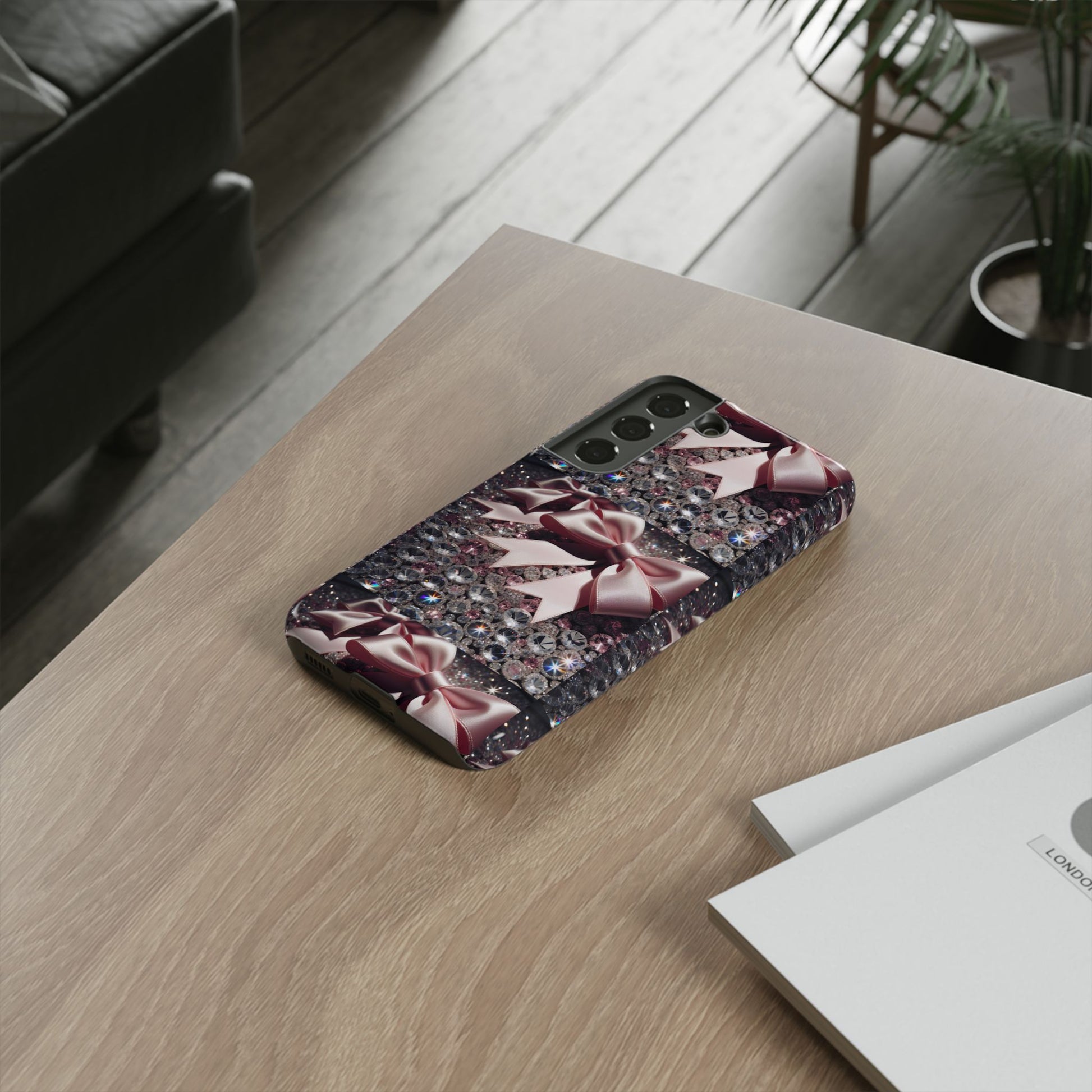 Elevate your style with this stunning phone case that seamlessly combines beauty and durability. Featuring a mesmerizing design adorned with elegant bows and sparkling gems, this case not only protects your phone but also makes a fashion statement. Ideal for those who appreciate a touch of glamour in their everyday lives, it fits perfectly into various settings—from casual outings to festive events. Whether you’re shopping for yourself or searching for the perfect gift for a friend, this phone case is a great choice for birthdays, holidays, or any celebratory occasion. It is designed for adults who want to showcase their personality while keeping their devices safe.